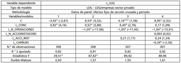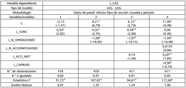 Al realizar el análisis de datos de panel se observó que la variable L_CONC mantiene una relación positiva con respecto a la variable L_ILIQ; sin embargo, pierde significancia en el cuarto submodelo, que contiene todas las variables por estudiar cuando se incluyen las variables L_N_ACCIONISTASORD y L_CAPBURS. También L_ACCI_INST generó una relación positiva, en tanto L_N_OPERACIONES presentó el mejor comportamiento y el mayor peso dentro del modelo, mostrando una relación inversa con respecto a la variable dependiente, seguida por L_CAPBURS; en contraste, L_ACCIONISTASORD no resultó relevante en el modelo de estudio.