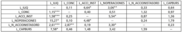 En términos generales, la correlación entre las variables explicativas con la dependiente es alta, pues en la mayoría de los casos el R^2 ajustado fue superior al 90%; sin embargo, solamente la significancia de los coeficientes de L_N_OPERACIONES y L_CAPBURS siempre se mantuvo constante por debajo del 0,05; ambas establecieron una correlación negativa con L_ILIQ y, por ende, se comportaron mejor en comparación con las demás variables.