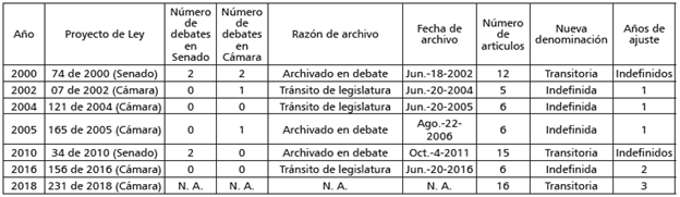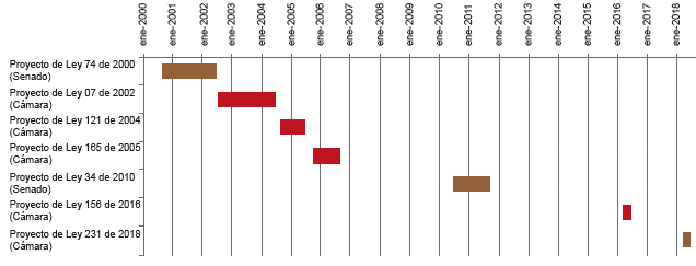 Durante lo corrido del siglo XXI se han radicado en el Congreso siete proyectos de redenominación del peso colombiano. En la gráfica 1 se presenta la línea de tiempo de estos proyectos. A continuación, se destacan los aspectos más importantes de cada proyecto y su trámite por el Congreso.