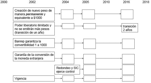En la sección anterior se discutieron en detalle los sietes proyectos de redenominación que se han radicado en el Congreso durante el siglo XXI (tabla 1). De la discusión se puede evidenciar que, si bien existen muchas similitudes entre todos los proyectos, estos se pueden clasificar en dos grupos: los proyectos de redenominación permanente al nuevo peso y los que no. Los primeros se caracterizan por ser cortos e implicar un paso del peso al nuevo peso de manera permanente; estos proyectos comprenden los radicados en 2002, 2004, 2005 y 2016. En la figura 1 se presenta de manera esquemática un resumen del análisis realizado. Es claro que no ha existido mucha innovación en los fallidos proyectos de ley de este grupo.