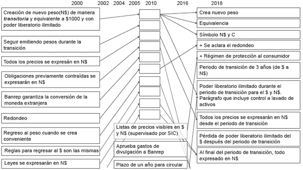 El segundo conjunto corresponde a los proyectos de redenominación transitoria al nuevo peso; se caracterizan por tener muchos más artículos e implicar dos periodos: uno de transición del peso actual al nuevo peso y otro del nuevo peso de regreso a la denominación de peso. En la figura 2 se presenta de manera esquemática un resumen del análisis realizado para este grupo, en el cual ha existido un poco más de innovación que en el otro conjunto. Claramente, el proyecto de ley de 2018 presenta la mayor cantidad de nuevas disposiciones frente a los proyectos anteriores; no obstante los nuevos detalles de este proyecto, donde parece existir la necesidad de aclarar más detalles que en los otros proyectos no se encontraban, no parece existir mucho espacio para innovar frente a los proyectos anteriores.