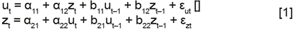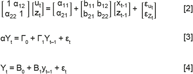 Los modelos VAR desarrollados por Sims (1980) permiten resolver el problema de endogenei-dad de las variables; para ello, se requiere escribir el sistema de ecuaciones a una expresión reducida y matricial, donde se puede apreciar cómo los choques de una variable afectan tanto a esta como a las demás. Se parte de las siguientes ecuaciones para ejemplificar un VAR de primer orden, donde ut y Zt son I(1) y los errores εut y εzt son choques, representados por un proceso ruido blanco con media cero y varianzas constantes. El modelo se escribe como el siguiente sistema de ecuaciones: