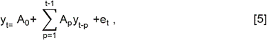 El resultado es un modelo de ecuaciones simultáneas con la particularidad de que sus variables son endógenas. De forma matricial, el modelo VAR se escribe de este modo: