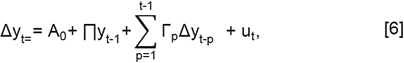 Diferenciando en los dos lados de la ecuación Yt-i pueden reorganizarse los términos; por lo tanto, un modelo VAR se puede representar como un modelo VECM de la siguiente forma: