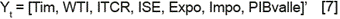 Se plantea un modelo de ecuaciones simultáneas conformado por el logaritmo de PIB del Valle del Cauca, el logaritmo de sus exportaciones, el logaritmo de sus importaciones, el índice de seguimiento económico para Colombia (ISE), el logaritmo de los precios del petróleo WTI y el índice de tasa de cambio real (ITCR). Según Bjørnland (2009), en este tipo de modelos se debe establecer un orden de exogeneidad de las variables, donde la primera no reacciona a las fluctuaciones de las otras debido a su relación contemporánea, lo cual no permite analizar cuáles se verán más afectadas por los choques de las otras. Dado lo anterior, Yt es un vector 7 x 1 de variables endógenas organizadas por su orden de exogeneidad: