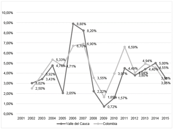 El Valle del Cauca aportó al producto interno bruto (PIB) nacional un 10,0% para 2016, participación importante que lo posiciona en el crecimiento económico colombiano respecto a otros departamentos. Desde los noventa, el Valle se ha caracterizado por la ampliación en sus actividades industriales, financieras y agrícolas, y por poseer uno de los mayores ingresos por habitante (PIB per-cápita) en el país (17,7 millones) (Departamento Administrativo Nacional de Estadística [DANE], 2016). No obstante, en la primera década del siglo XXI registró una marcada desaceleración (figura 1), por debajo del promedio nacional.