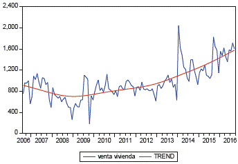 En la gráfica 11 se puede ver que la venta de vivienda en Cali y sus alrededores ha tenido fluctuaciones considerables en los últimos años; sus niveles más bajos se dieron entre 2008 y 2009 debido a la crisis inmobiliaria de 2008. La gráfica 12 muestra que en los primeros meses de 2008 la tendencia de la venta de vivienda tuvo un decrecimiento del 12,8%, recuperándose en septiembre de 2009 y repuntando a finales de 2010 con tasas de crecimiento de 9,1%. Este comportamiento mostró una recuperación rápida del sector. Los mejores momentos del sector se han visto en abril del 2014, con tasas alcistas de 15,4%. En 2015 y 2016 se han visto tasas de crecimiento entre 14,5% y 15%.
