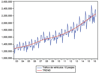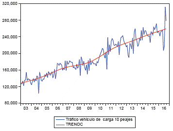 Paran analizar el sector de transporte del Valle del Cauca, se usó como proxy el tráfico de vehículos de particulares por los 10 principales peajes del departamento, e igualmente se utilizó la misma variable para el transporte de carga. El tráfico por las principales vías del departamento ha aumentado extensamente desde 2003, tanto en el paso de vehículos particulares como de carga (gráficas 13 y 14). El crecimiento de la tendencia de tráfico de vehículos ha tenido sus picos a finales del 2014 e inicios del 2015, con tasas alcistas tendenciales de hasta 6,50% comparadas con el año inmediatamente anterior para carros particulares. Igualmente, la tasa de aumento de la tendencia de esta variable ha sido mínimo de 5,0% (gráfica 15). Para el tráfico de carga, los datos se comportan de una manera muy similar; su pico de crecimiento tendencial fue en los últimos meses de 2014, con tasas de 4,4%, y su crecimiento mínimo no ha sido menor al 3%.