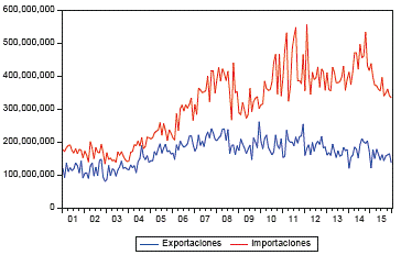 Donde ITCR es el precio relativo de los bienes nacionales frente a los extranjeros, que está ajustado a la tasa de cambio nominal (S), los precios nacionales (p) y los precios internacionales (Pf). Por último, se tomaron datos mensuales desde enero de 2001 hasta diciembre de 2015.