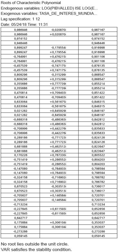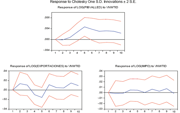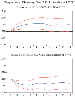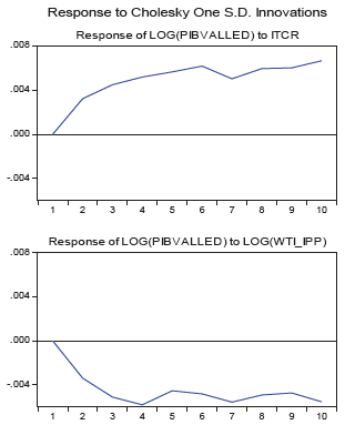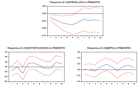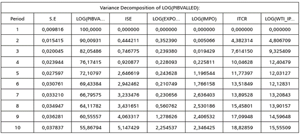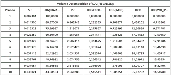 Las tablas 4 y 5 muestran la descomposición de varianza para ambos modelos, lo cual permite identificar qué tanto afecta el cambio de una variable sobre la fluctuación de otra. En principio, se puede observar que la mayoría de la variabilidad de la demanda agregada del Valle del Cauca está dada por los rezagos de ella misma, debido a que el presente de la demanda agregada del Valle está explicada hasta por un 100% por el primer periodo de su pasado. Un dato interesante en los dos modelos es que la tasa de cambio puede explicar en gran medida las fluctuaciones de la actividad económica vallecaucana (18% modelo VECM), y de igual forma lo hacen las fluctuaciones del precio del petróleo.