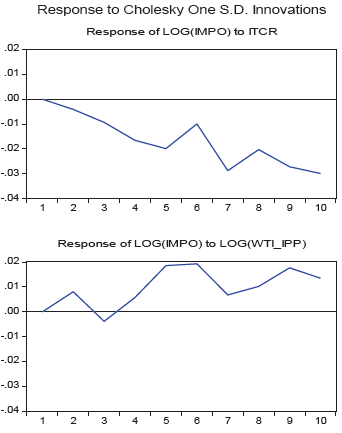 Respecto de las importaciones, el modelo permite inferir que un impulso en la ITCR afecta los precios relativos de los productos extranjeros en el mercado nacional, volviéndolos más costosos para los consumidores internos; esto, en consecuencia, genera una reducción en las importaciones nacionales. Las figuras 19 y 20 muestran la respuesta de las importaciones del Valle del Cauca frente a innovaciones en el precio del petróleo WTI y el ITCR a una desviación estándar. Como se puede observar, un choque positivo en el WTI genera una respuesta positiva a las importaciones del Valle del Cauca, pero solo es significativo en el quinto y décimo mes para el modelo VAR.