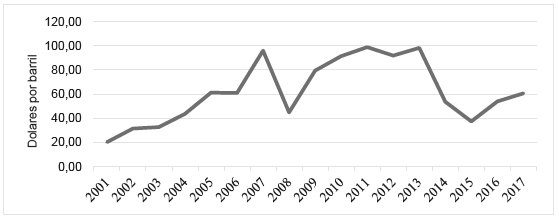 La variable precios de petróleo en países exportadores de crudo genera un gran efecto en la tasa de cambio y puede promover una posible enfermedad holandesa: se desarrolla un impacto negativo sobre la industria de un país, debido a que la revaluación de la moneda interna por el gran número de exportaciones del sector minero-energético desincentiva la producción y estimula la importación, tema ampliamente estudiado por Corden (1984), Égert y Leonard (2008), Poncela, Senra y Sierra (2017), entre otros. Una hipótesis de trabajo podría ser que el Valle del Cauca se vea afectado debido a su estructura económica, ya que una gran entrada de divisas causada por altos precios del petróleo generaría una revaluación de la moneda interna y haría menos competitiva la industria departamental. Esto se suma al deterioro del consumo por el lado de otros ingresos externos, como en las remesas, puesto que el Valle del Cauca recibe el 29% del total anual (Banco de la República, 2017), lo que le representó un poco más de 1500 millones de dólares en 2017, equivalentes al 4,7% del PIB y alrededor del 87% del total exportado por el departamento en el mismo año.