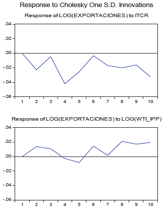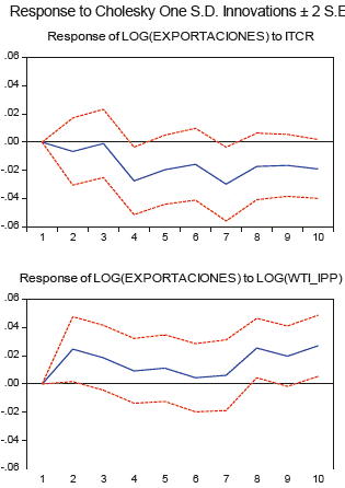 De igual forma, se analizó el comportamiento de las exportaciones cuando hay un impulso de los precios del petróleo y la tasa de cambio real. Las gráficas 21 y 22 presentan la respuesta de las exportaciones ante un impulso del ITCR y el WTI a una desviación estándar; se observa allí que un aumento en los precios del petróleo genera un impacto positivo y significativo en las exportaciones en los periodos 1, 2, 8 y 10 para el modelo VAR. Para el modelo VECM se tienen los mismos efectos para los mismos periodos, aunque no es claro que aquellos sean positivos en todos los meses. Esto se debe a que un alza en la cotización del WTI provoca una revaluación de la moneda interna, y puesto que la industria del Valle del Cauca usa materias primas y tecnología importada, tiene lugar una reducción de costos por el abaratamiento relativo de los productos extranjeros.