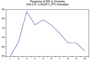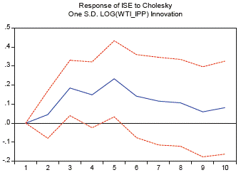 Por otro lado, con el fin de confirmar cuál es el efecto de un alza de los precios del petróleo con respecto a la economía colombiana, las figuras 23 y 24 muestran la respuesta del indicador de seguimiento económico para Colombia (ISE) frente a un impacto positivo en el precio del petróleo (WTI) a una desviación estándar. Ello confirma lo encontrado por Uribe y Ulloa (2011) y González y Hernández (2016), que identifican una relación positiva entre el aumento de los precios del petróleo y el crecimiento del PIB de Colombia, donde para el modelo VAR los impactos son significativos en los periodos 4 y 5.