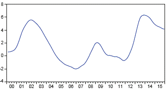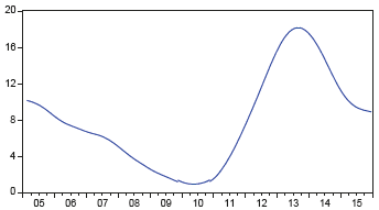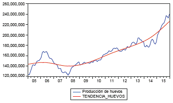 La gráfica 9 muestra la producción de huevos por toneladas en el Valle del Cauca, la cual tuvo un crecimiento considerable desde 2005. Por su parte, en la figura 10 se observa la variación anual de la tendencia; vale señalar que en octubre de 2007 el crecimiento llegó a niveles de -3% (el punto mínimo), y en los años posteriores hubo una recuperación, con un punto máximo de 11,03% en septiembre de 2015. Este análisis se hace a partir de la producción de huevos desde 2004 hasta 2015.