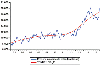 En el subsector de alimentos, el departamento tiene clústeres importantes como la producción de proteína blanca y azúcar. La producción de proteína blanca y sus derivados es la segunda a nivel nacional (Cámara de Comercio de Cali, 2016), lo que los hace parte de la industria del departamento. La gráfica 7 muestra la producción de carne de pollo en toneladas y su tendencia, lo que permite analizar dicho subsector a partir de sus históricos. Así, el estudio arrojó que la producción de carne de pollo ha tenido un aumento paulatino entre 2005 y 2015, con cambios estructurales en su tendencia en 2011. La gráfica 8 muestra la variación anual de la tendencia de la producción de carne de pollo, que ha tenido variaciones positivas, aunque ello ha estado acompañado de desaceleración en el periodo 2004-2010. Igualmente, el mayor punto de crecimiento fue de 18,2% en septiembre del 2013 y un punto mínimo de 0,8% en junio del 2010.
