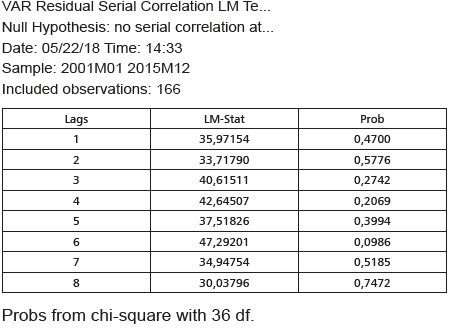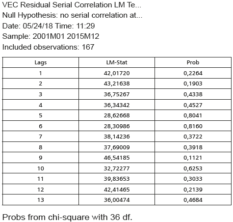 Hipótesis nula: no hay correlación serial del orden h, la estadística LM está distribuida asintóticamente x2 con k2 grados de libertad.