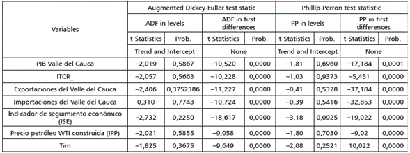 En principio, para realizar un vector de corrección de error con variables externas o un vector autorregresivo en niveles, las variables de estudio deben cumplir con la relación de cointegración. Se dice que las series en niveles están cointegradas cuando su combinación lineal genera residuales estacionarios. Esto indica que el comportamiento de las series presenta patrones de conducta relacionados que impiden su libre movimiento, porque su dinámica está enlazada en el largo plazo, donde converge a un estado de equilibrio (Engle y Granger, 1987). Para identificar el nivel de integración de las series, se realizan pruebas de raíz unitarias "Augmented Dickey-Fuller test static y Phillip-Perron test statistic"; la hipótesis nula de estas pruebas plantea la existencia de raíces unitarias, lo que quiere decir que las variables son integradas de orden uno, por lo que no son estacionarias.