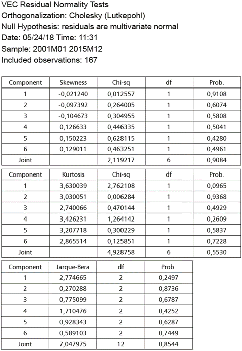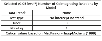 Se realiza la prueba de cointegración de las variables; en la tabla 3 se muestra el resumen de los casos en los que se puede aplicar la prueba de cointegración de Johansen, sin intercepto ni tendencia, con intercepto y sin tendencia, entre otras opciones, además de ofrecer los resultados para los dos criterios disponibles: traza y máximo valor propio. Los resultados arrojan, según el caso y el criterio, entre 1 y 3 relaciones de cointegración, lo cual posibilita inferir que muy probablemente estas variables están cointegradas. Esto hace posible determinar que es factible estimar el modelo VECM, por lo cual se utilizará una relación de cointegración para la estimación del modelo.