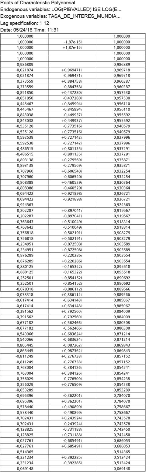 Donde Π = -(lk - A1 - ... - Ap) y Гp = (Ai+1 + ... + Ap), i = 1 + 2 + 3 ... ... p - 1; yt y es un vector de variables no estacionarias k X 1, Π es una matriz singular con tamaño m X m, la cual captura las r relaciones de cointegración que estima las relaciones a largo plazo; para ello se debe tener en cuenta que las matrices con un rango r con un tamaño m X m son de rango completo, y en este caso se puede obtener π = αβ’.. La sumatoria de Гp recoge todas las relaciones a corto plazo de cada una de las ecuaciones, A0 recoge el vector de constates del sistema (Ricci y Ramojo, 2012).