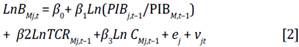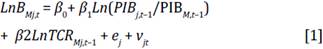 Donde BMj,t, representa el balance bilateral entre México y su socio comercial , medido como la razón entre exportaciones e importaciones de bienes. Un incremento relativo del nivel de ingreso del socio en relación con el de México (PIBj/PIBM) impulsaría las exportaciones mexicanas, por lo que se esperaría una mejora del balance externo. Por su parte, un incremento en el tipo de cambio real bilateral (TCRMj) -una depreciación del peso mexicano- implicaría una mejora en la competitividad por precios de la economía mexicana, lo que se reflejaría en una mejora del balance externo. Las variables independientes son incluidas con un rezago para controlar posibles problemas de doble causalidad. Además, nótese que las variables son incluidas en logaritmos y, en consecuencia, los coeficientes miden elasticidades.