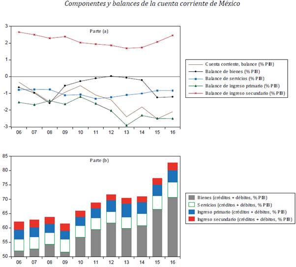 No obstante, dejando de lado la relación con Estados Unidos, el balance externo de la economía mexicana ha tenido un sesgo deficitario. En contabilidad nacional, el balance externo -medido como el saldo en la cuenta corriente- expresa decisiones de ahorro-inversión a partir de la diferencia entre el ahorro nacional y la inversión. En el largo plazo, la presencia de déficits persistentes en cuenta corriente se verá reflejada en un incremento de la deuda y, potencialmente, en la vulnerabilidad de la economía ante perturbaciones externas. Adicionalmente, la mayor parte de las operaciones dentro de la cuenta corriente (sumando créditos y débitos) se ha dado en la cuenta de bienes. Con datos de la Organización para la Cooperación y el Desarrollo Económicos (OCDE), la suma de créditos y débitos del comercio de bienes alcanzó 70,6% del PIB en el 2016, mientras que la suma total de débitos y créditos de todos los componentes de la cuenta corriente llegó al 82,7% del PIB.