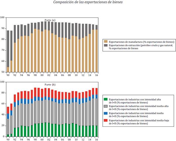 ¿Por qué enfocarnos en las exportaciones de industrias intensivas en tecnología como determinantes del balance bilateral de bienes? En México, la apertura comercial implicó un cambio en la estructura de las exportaciones, disminuyendo la proporción de los bienes de extracción (petróleo y gas natural) e incrementando la proporción de bienes manufacturados. Como lo muestra la figura 2 (parte a), en 1990 las exportaciones de bienes de extracción representaban el 33,5% de las exportaciones de bienes, mientras que en el 2016 solo alcanzaban la cifra de 4,1 %. Por su parte, las exportaciones de bienes manufacturados representaban el 54,7% de las exportaciones de bienes en 1990 y se incrementaron hasta 89,1% en el 2016. Una parte importante de este cambio vino del impulso a las manufacturas a partir de la apertura comercial, mientras que otra parte se explica por la caída en el precio del petróleo a mediados de los años ochenta (Moreno y Ros, 2010).