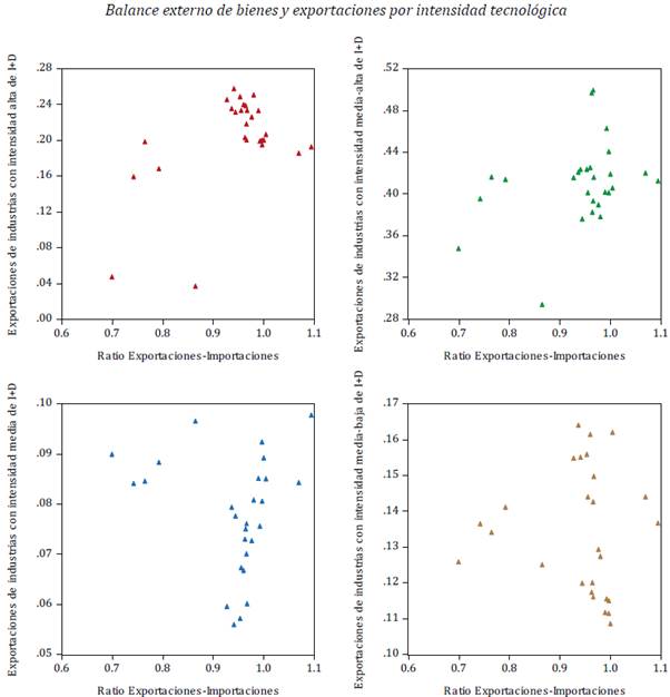 Por otro lado, solo recientemente se ha subrayado la relación entre el balance externo y las exportaciones consistentes de bienes con un alto valor añadido1, lo cual ha servido para explicar los desequilibrios externos en la eurozona (Wierts, Van Kerkhoff y De Haan, 2014; Carrasco y Peinado, 2015; Carrasco y Hernandez, 2017). Así, los países con una alta proporción de exportaciones de bienes de alto valor añadido -como los bienes de alta tecnología- presentan una estructura económica que les permite adaptarse al entorno cambiante de la economía mundial, absorber a personal altamente cualificado y producir bienes que se diferencian en términos de calidad, variedad y exclusividad, lo que a su vez reduce la vulnerabilidad de sus exportaciones ante cambios en los precios y el ingreso.