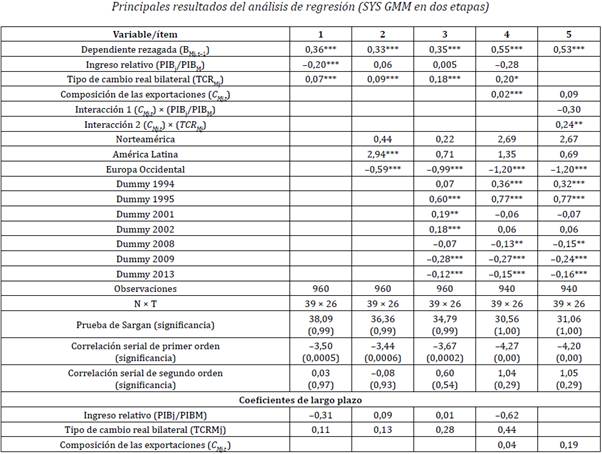 La tabla 1 presenta los principales resultados derivados del análisis de regresión. Es importante notar que el modelo dinámico está bien justificado, ya que la variable dependiente (balance comercial) rezagada e incluida como explicativa presenta significancia estadística. Además, las pruebas de autocorrelación de segundo orden y de validación de los instrumentos son superadas en todos los casos. Obsérvese que el estimador SYS GMM proporciona los coeficientes de corto plazo. Para conocer los coeficientes de largo plazo, hay que dividir el coeficiente de corto plazo entre uno menos el coeficiente de la variable dependiente como regresor.