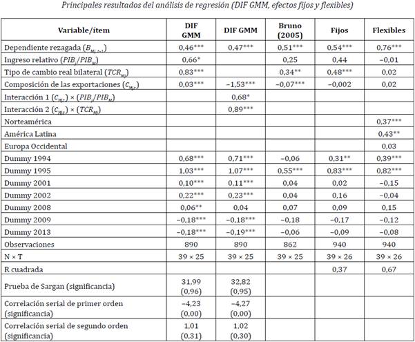 El tipo de cambio real confirma el efecto positivo sobre la balanza comercial, aun con la inclusión de las variables dicotómicas por región y años de crisis. En cambio, el efecto del ingreso relativo no es robusto. Aunque el coeficiente cambió a signo positivo, la inclusión de los años de crisis le hace perder significancia estadística.