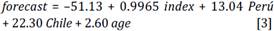 A negative value of the intercept does not make economic sense, due to which it is not interpreted; however, it was not removed from the model, because without this variable, the R-squared was negative. The final equation, which relates the dependent variable forecast with the independent variables index (anchor), country and age, is: