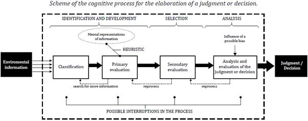 A linear path runs through all three parts of the cognitive process; nevertheless, the path will hardly be linear. There is a possible interruption in each phase due to multiple causes, such as the lack of sufficient information or the impossibility of advancing to a next phase, which leads to a reprocessing between the phases of this procedure. When people face a problem, such as the need to make a judgment or decision, first, they obtain external information from the environment. Once the information has been collected, the cognitive process will begin with the stage called "identification and development," which is composed of two phases. The first one, called "classification," prioritizes the information obtained by level of importance. The data considered most relevant will be used in the next phase called "primary evaluation," which is where the preparation of the trial or decision begins. Its source of information has been defined during the previous stage and, here, the type of judgment the individual is going to build, analyze, and select, or how the decision will be made, is addressed. The process to make judgments or decisions is carried out by recovering mental representations stored in memory, which constitute an additional source of information and are used when it is impossible to have all the information available to deal with the problem. In case of insufficient available data, an option is to look for more information. This mechanism of the mind, which allows the elaboration of a judgment or a decision, is called a heuristic and its probable effect is the manifestation of a cognitive bias in later phases, which leads to errors and will be contained in the final judgment or decision.