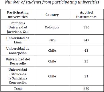 The universities that participated in the experiment were: Pontificia Universidad Javeriana, Colombia; Universidad de Concepción, Universidad del Desarrollo, and Universidad Católica de la Santísima Concepción, Chile; and Universidad de Lima, Peru. 690 undergraduate students participated and, after filtering the database, 670 valid answers were found.