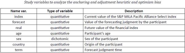The applied experiment allowed obtaining different information from participants. Table 2 shows a summary of the variables obtained and their description. With this information collected, an econometric study was conducted to verify the influence of the anchoring and adjustment heuristic and optimism bias when making a financial forecast, in particular that of the S&P MILA Pacific Alliance Select index.