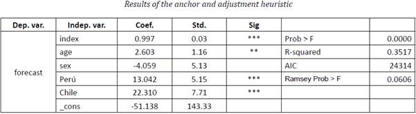 Table 3 summarizes the results of the model obtained with the regression corrected for heteroscedasticity and with an R-squared result of 0.3517 and a value of the Akaike information criterion (AIC) of 24314, noting a strong relationship between the dependent variable forecast and the independent variable index. The coefficient of the index is very close to one, which means that, leaving the rest constant, an increase of one point in the value of the index increases the value of the forecast by one point, which is statistically significant at 1%. This conclusion allows us to determine that there is evidence that, in the elaboration of a forecasting judgment, the presentation of an initial value before the elaboration of the judgment influences, through an anchor effect, the value of the financial forecast.