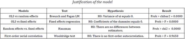 Since records were organized with preset time intervals at a day, a week and a month, we opted for the use of an econometric data panel model. Table 4 summarizes the tests performed, their hypotheses, and the results used to choose the final model.