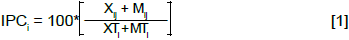 En la fórmula, Xij representa las exportaciones del país i al país j; Mij. son las importaciones del país i al país j; XT¡ son las exportaciones totales del país i, y MTi representa las importaciones totales del país i.