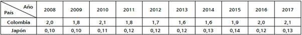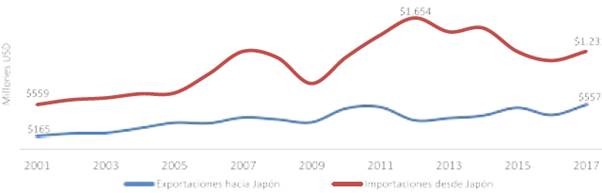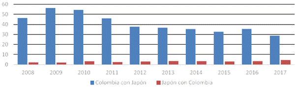 Las relaciones comerciales entre Colombia y Japón, medidas por sus flujos de importaciones e importaciones, aunque muestran valores pequeños, han presentado un crecimiento durante el siglo XXI. Como se evidencia en la figura 1, las importaciones se han duplicado, al tiempo que las exportaciones se han incrementado más de tres veces, alcanzando en el 2017 su máximo valor histórico. Estos resultados hacen de Japón el socio comercial más importante de Colombia en Asia, después de China, y por encima de India y Corea del Sur. La balanza comercial para Colombia ha sido deficitaria durante el periodo analizado, aunque esta brecha ha presentado una disminución relativa.