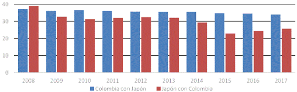 Existe una complementación moderada en ambos países y relativamente estable para Colombia. La complementación es mayor para este último, lo que demuestra que existe un potencial comercial mayor para Colombia que para Japón. La reducción de la complementariedad de Japón desde el 2015 responde a la devaluación del peso colombiano, pues redujo la compra de mercancías, incluidas las ofertadas por el país asiático. Se observa entonces que en ambos países existe demanda de los bienes que exporta su socio comercial y, en consecuencia, hay potenciales ganancias respecto al acuerdo.