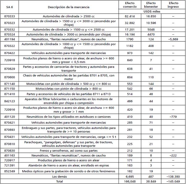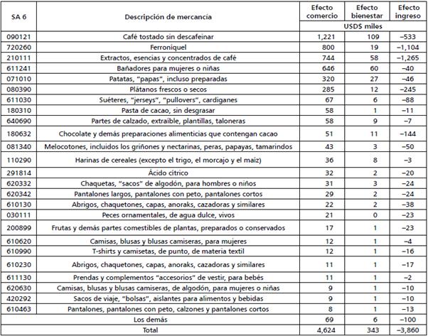 La tabla 3 presenta los 25 productos con mayor efecto comercio como resultado de la desgravación arancelaria realizada por Colombia, de modo que estos productos generan mayor beneficio del acuerdo comercial. Para este país, se aumenta el bienestar en US $38,8 millones, mientras que el efecto comercio indica que las importaciones se incrementan un total de US $166 millones. Las pérdidas fiscales para Colombia por concepto de aranceles, equivalentes al efecto ingreso, alcanzan la cifra de US $145 millones.