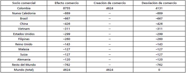 Los resultados de efecto comercial para Colombia presentados en la tabla 2 muestran que las ganancias totales generadas por la desgravación arancelaria ascienden a poco más de US $166 millones. Evidentemente, el país que más se beneficia del acuerdo comercial es Japón, pues su efecto comercio asciende a US $266,3 millones, de los cuales US $166 millones provienen de creación de comercio; es decir, ese es el valor que el acuerdo comercial generaría a partir del desplazamiento de productores nacionales ineficientes por productores extranjeros más eficientes. Por otra parte, del total efecto comercio, US $100,2 millones son causados por la desviación de comercio, esto es, productores ineficientes de Japón desplazan a productores más eficientes de otros socios comerciales de Colombia, principalmente México, Estados Unidos y Corea del Sur.