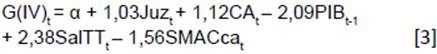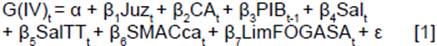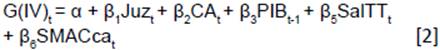 G(IV)t es una variable dependiente, por ser el capítulo de gastos el que recoge las prestaciones del FOGASA y, por tanto, el que puede estar más o menos influenciado por la política de consolidación fiscal o por las variables de tipo económico y laboral relacionadas con el Fondo.