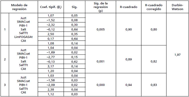 La tabla 2 representa la capacidad que tienen las macromagnitudes y la reforma laboral para explicar la evolución de las prestaciones del FOGASA. El método utilizado es un modelo de regresión que realiza una selección de variables explicativas "hacia atrás" tres veces consecutivas (modelo de regresión 3 [MR3]). Al finalizar el proceso de selección de variables, quedaron excluidas como factores explicativos de la evolución de las prestaciones del FOGASA aquellas variables que mantenían un nivel de significación superior al 0,05, esto es, el salario medio que recibe un trabajador en España en el año t (Salt) y el importe límite que este Fondo utiliza para abonar las prestaciones a los trabajadores cada año (LimFOGASAt).