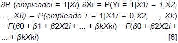 Donde F(.) es la distribución normal acumulada del modelo probit. Cabe anotar que si una variable Xi es dicotómica, como se usará regularmente en las regresiones, el análisis del efecto de la variación se mide a través de la diferencia entre los valores determinados por: