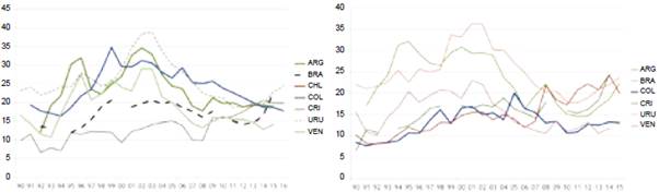 La figura 1 revela el comportamiento de la tasa de desempleo juvenil por nivel de educación (alto y bajo)1 en una muestra de países latinoamericanos. En cuanto a la evolución del desempleo juvenil de alta educación, Colombia aparece dentro de los países con mayor desempleo de jóvenes, superado solo por Argentina y Uruguay entre el 2001 y el 2006. La figura también muestra un rasgo positivo: el desempleo juvenil de alta educación ha disminuido en los últimos años. En lo relativo a las tasas de desempleo de los jóvenes con baja educación, Colombia tiene las cifras más bajas de la región, similares a las de Venezuela, Brasil y Costa Rica. Se hace evidente, en consecuencia, la brecha entre el desempleo de jóvenes con alta y baja educación en Colombia sin parangón en otro país latinoamericano.