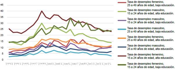 La figura 2 presenta la tasa de desempleo juvenil por género, edad y nivel educativo. Se encuentran en primer lugar las mujeres jóvenes y los grupos con alta y baja educación, aunque desde el 2006 hay una tendencia decreciente. A estos dos grupos les siguen hombres jóvenes con alta educación y mujeres adultas con alta y baja educación. En contraste, los hombres adultos con baja y alta educación y los hombres jóvenes con baja educación tienen las menores tasas de desempleo.