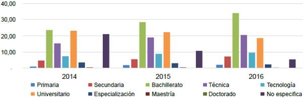 Se observa que los bachilleres, seguidos de los técnicos y universitarios, son los más demandados. En efecto, en el 2014 los bachilleres representaron el 23,5% de las vacantes demandadas por los empresarios, los técnicos representaron el 15,3% y los universitarios, el 23,1%. En el 2016 las vacantes demandaron en 33,7% bachilleres, 20,5% técnicos y 18,5% universitarios. En este periodo ha ocurrido un importante aumento de la demanda por bachilleres y una leve reducción de la demanda por universitarios.