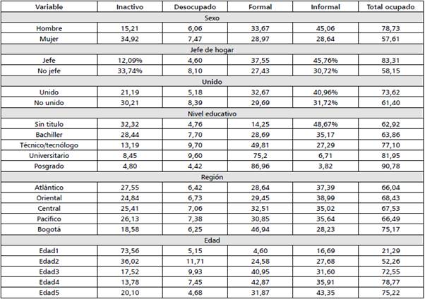 La tabla 1 presenta los datos descriptivos de las variables del modelo. En términos generales, se observa que los hombres, los jefes de hogar y los unidos tienen mayor porcentaje de ocupados dentro de cada grupo. Asimismo, a mayor nivel educativo, mayor proporción de ocupados y en la formalidad. La región con mayor proporción de ocupados es Bogotá, pero las demás presentan un porcentaje similar. Por último, según grupo de edad, los más jóvenes tienen el mayor porcentaje de inactivos y la menor proporción de ocupados. En los demás grupos aumenta la proporción de ocupados, aunque en la informalidad; esto sucede excepto en el grupo de edad 5, que tiene más personas formales que informales (véase el anexo 2, matriz de correlaciones).