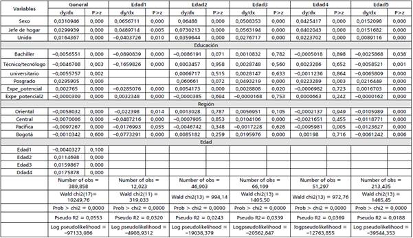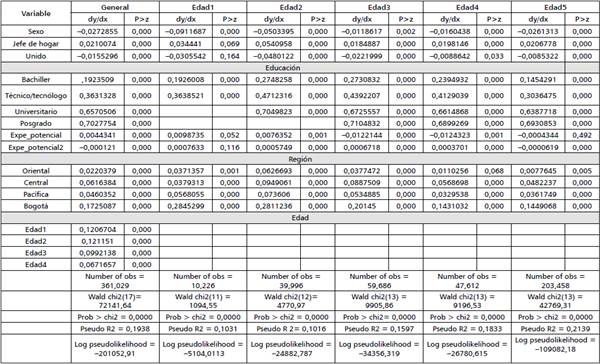 Por su parte, la variable educación evidencia todo su efecto en este modelo probit de empleo formal: el nivel educativo aumenta la probabilidad de estar en un empleo formal en el modelo general y en todos los grupos de edad. Esta probabilidad se incrementa con el nivel educativo, como lo refleja el mayor valor de los coeficientes cuando aumenta la educación. En el caso de la experiencia, esta muestra en el modelo general una relación positiva en los primeros años y negativa cuando se acumula a través del tiempo (efectos no lineales), lo que implica que a medida que aumenta la experiencia, disminuye su efecto en el empleo formal. En el caso de los grupos de edad se observa lo contrario en los grupos 3 y 4, donde el efecto positivo sobre el empleo formal llega cuando más se acumula experiencia, lo que indica que los primeros años de experiencia pueden ayudar a que se ocupen las personas, pero para que sea en el sector formal se requiere de cierta cantidad acumulada.