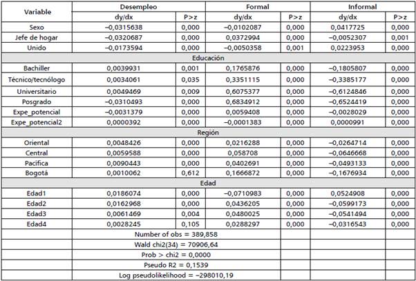 El análisis de la variable región muestra que en Bogotá hay mayor probabilidad de estar ocupado en el sector formal, y menor en el Pacífico. Vivir en la región Pacífico aumenta la probabilidad de estar desempleado; por el contrario, vivir en Bogotá la disminuye. Finalmente, en cuanto a la variable edad, se observa que para los más jóvenes (edad1 y edad2) aumenta la probabilidad de estar desempleado y en la informalidad (grupo1), y disminuye la probabilidad de estar ocupado tanto en el sector formal. En los grupos 2, 3 y 4 disminuye la probabilidad de estar informal, y se incrementa la de estar desempleado y formal. Con la edad aumenta la probabilidad de estar ocupado en el sector formal, en un efecto similar al de la educación.